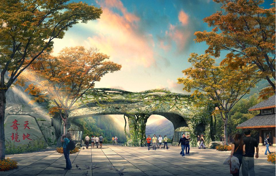 項目遵循“高起點、大視野、大旅游”原則,通過機構科學、嚴謹的咨詢方法和工具進行整合、提煉和分析,提出了“生態優先”、“國際發展”、“集群發展”、“項目拉動”、“和諧發展”五大策略,擬定“天坑地縫·天地人和”的主題定位。充分尊重現狀、利用現狀,采用軸線布局手法,形成本項目“一核一軸·三大片區”的布局結構。